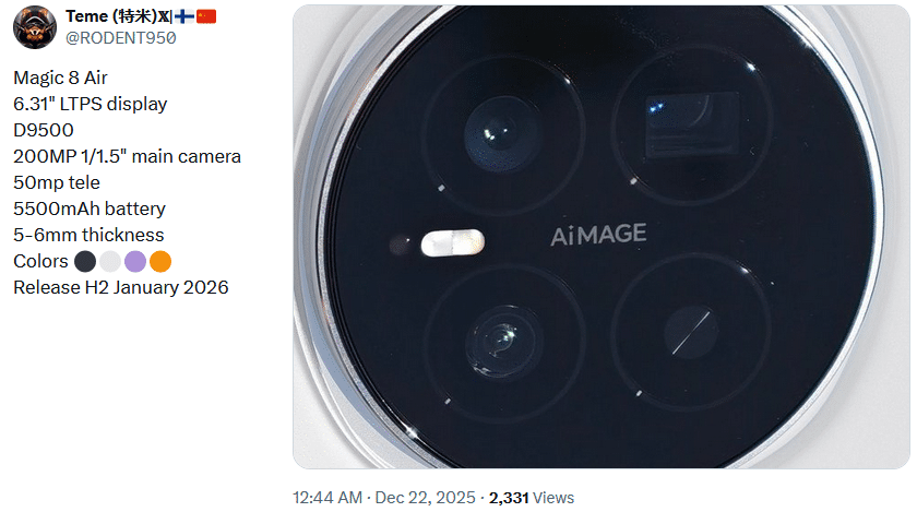 There is not much clarity about features like processor, RAM and telephoto and ultra wide lens of this device. Some leaks suggest Honor Magic 8 Air in place for this model. It will be matter of time before we get clear picture.