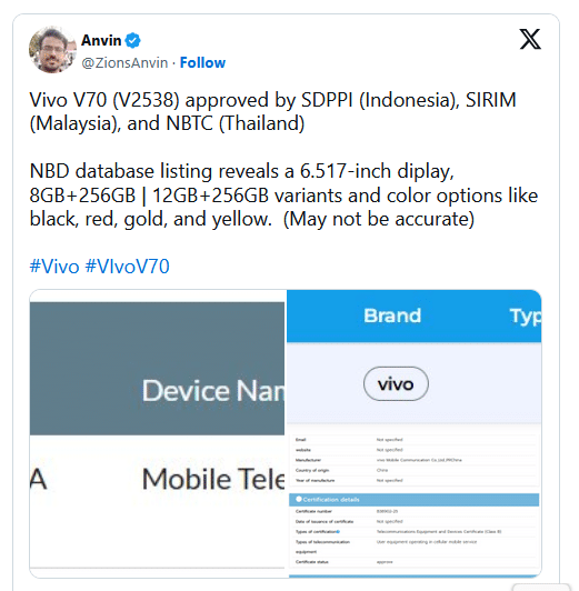 There was leaks for V series of Vivo smartphones coming up in the start of year 2026 and now one of them i.e. Vivo V70 is confirmed. The smartphone is set for launch in multiple countries like India, Malaysia as it got listed on their respective databases. The listing also revealed some of the features of Vivo V70 like 6.5 inch screen, 8GB/12GB RAM models and Snapdragon 7 Elite chip. The expected price of Vivo V70 in India will be Rs. 39,999 which is lower than the Vivo V70 Elite price.
